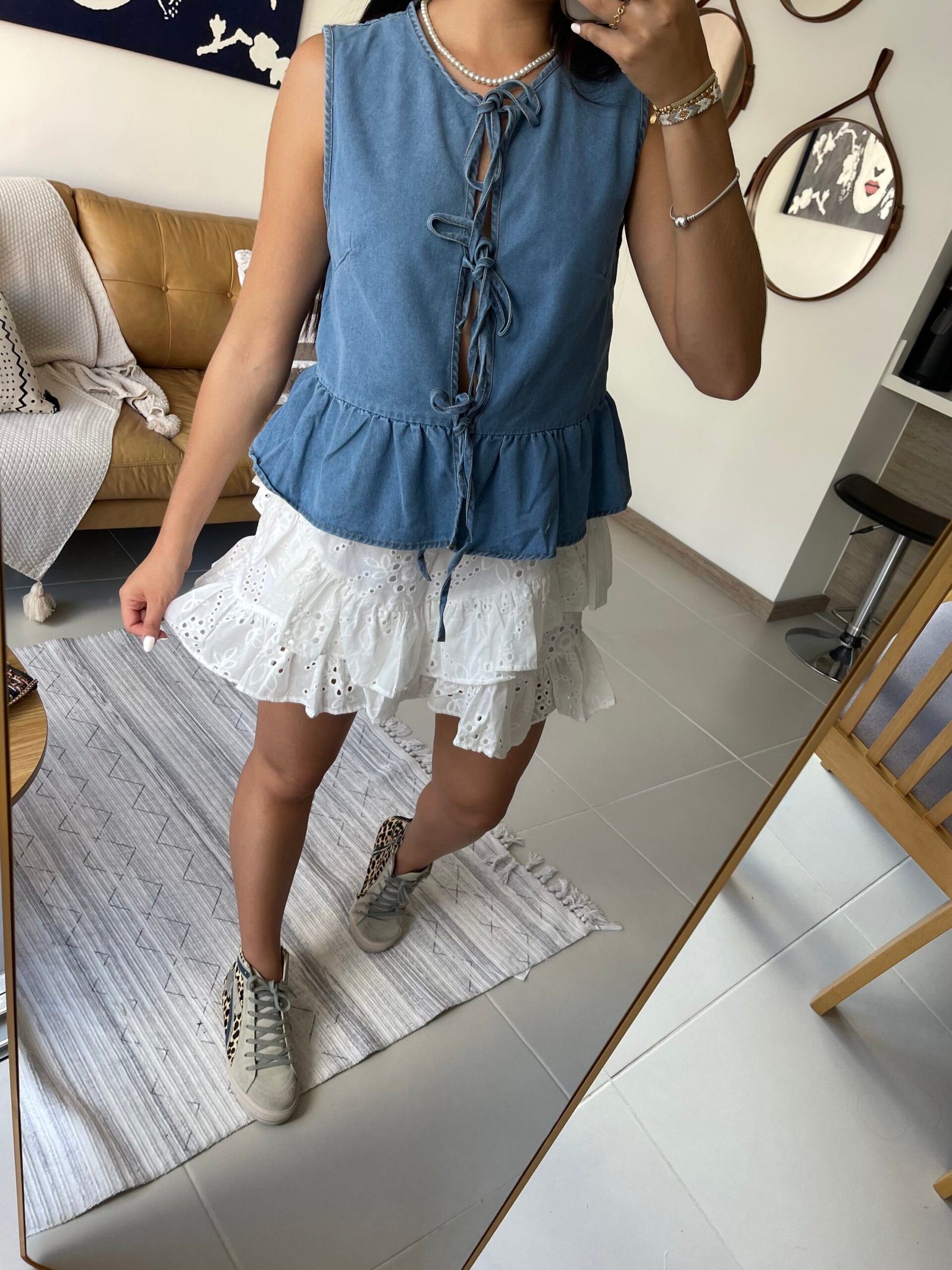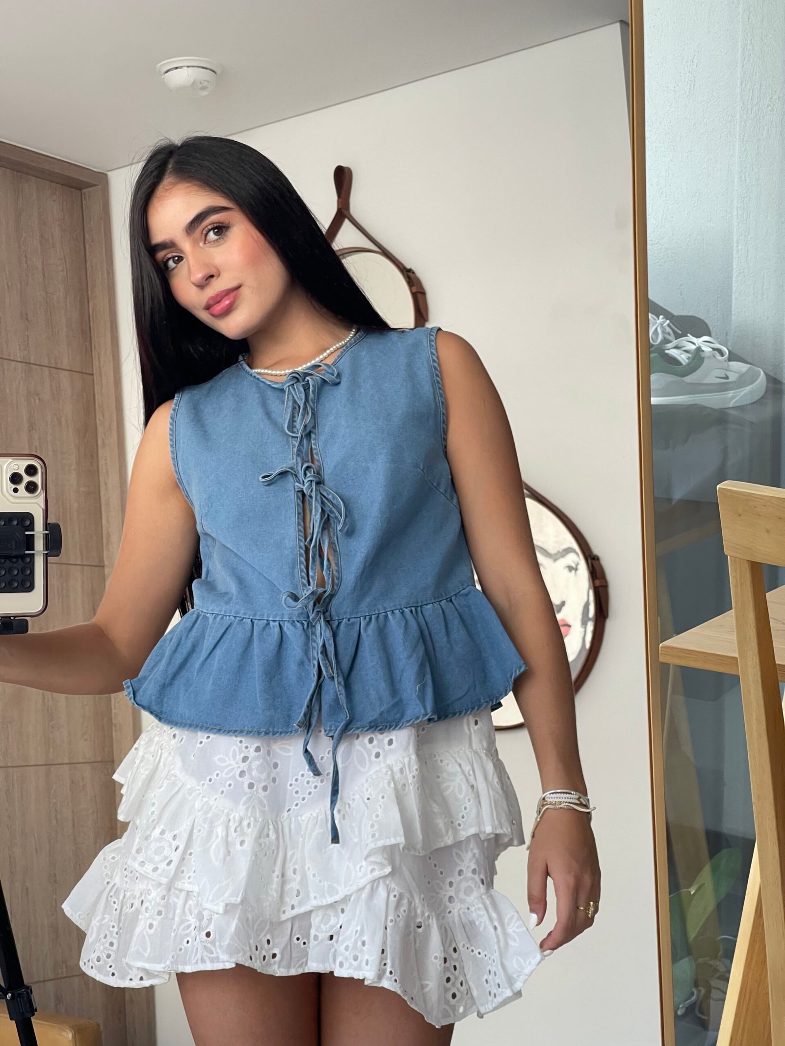 Fabricado con tejido de denim duradero y ligero, este chaleco brinda comodidad durante todo el día sin sacrificar estilo. Su diseño sin mangas facilita la frescura incluso en los días más cálidos, mientras que el corte peplum añade un toque juguetón y femenino que resalta tu silueta. Las cintas al frente permiten personalizar tu estilo al máximo, ya sea con un lazo delicado o una apariencia más suelta y relajada.