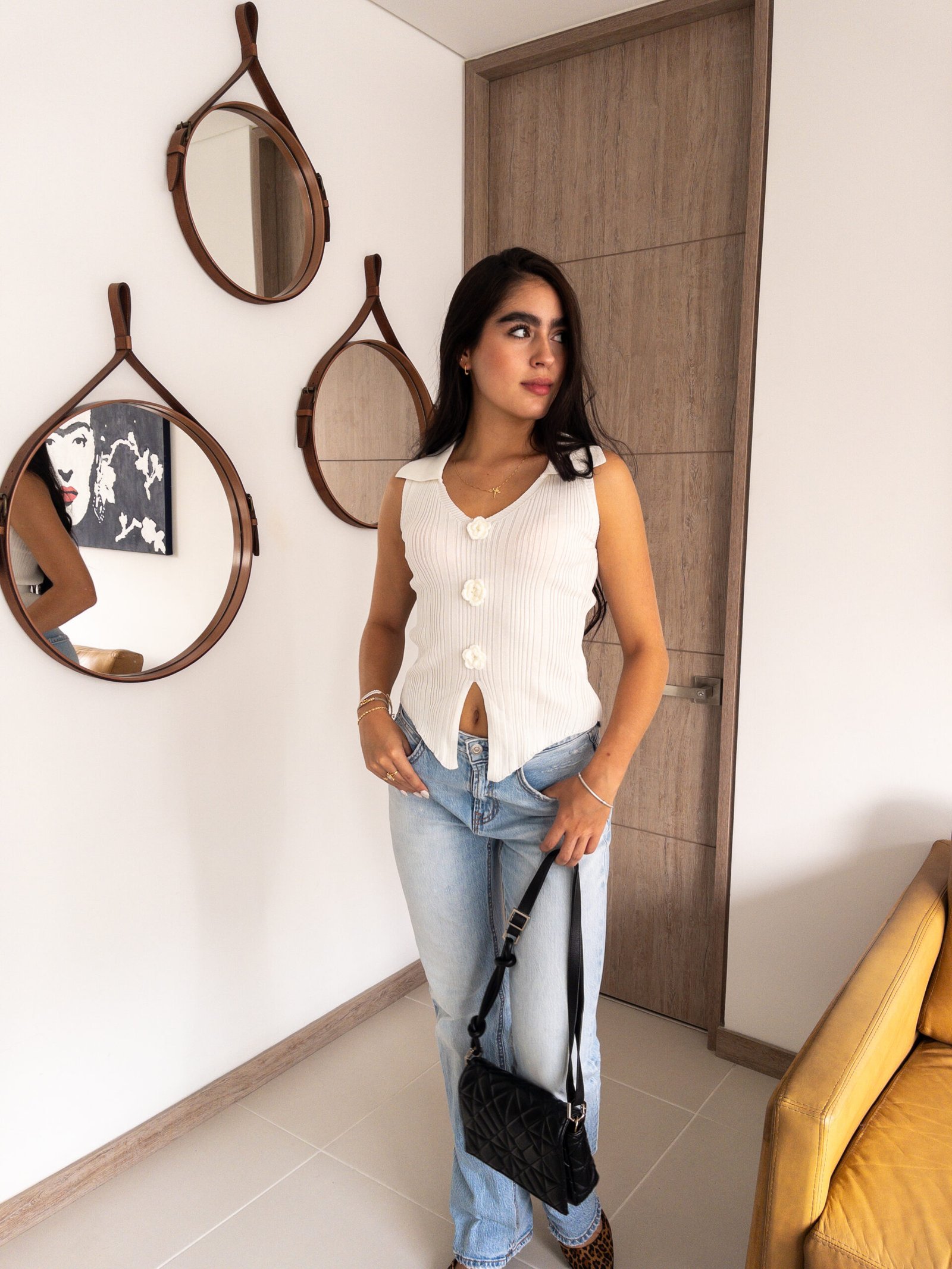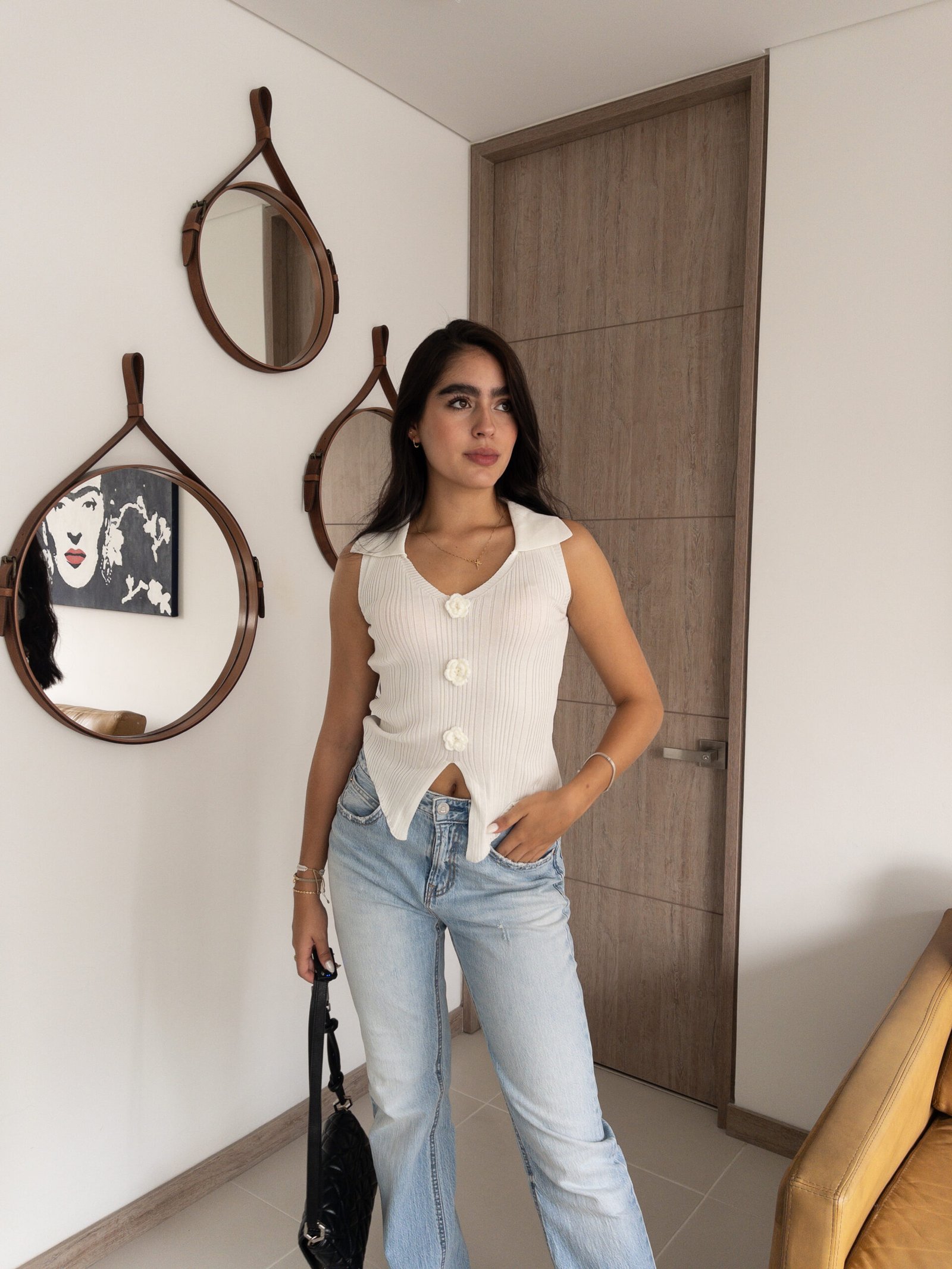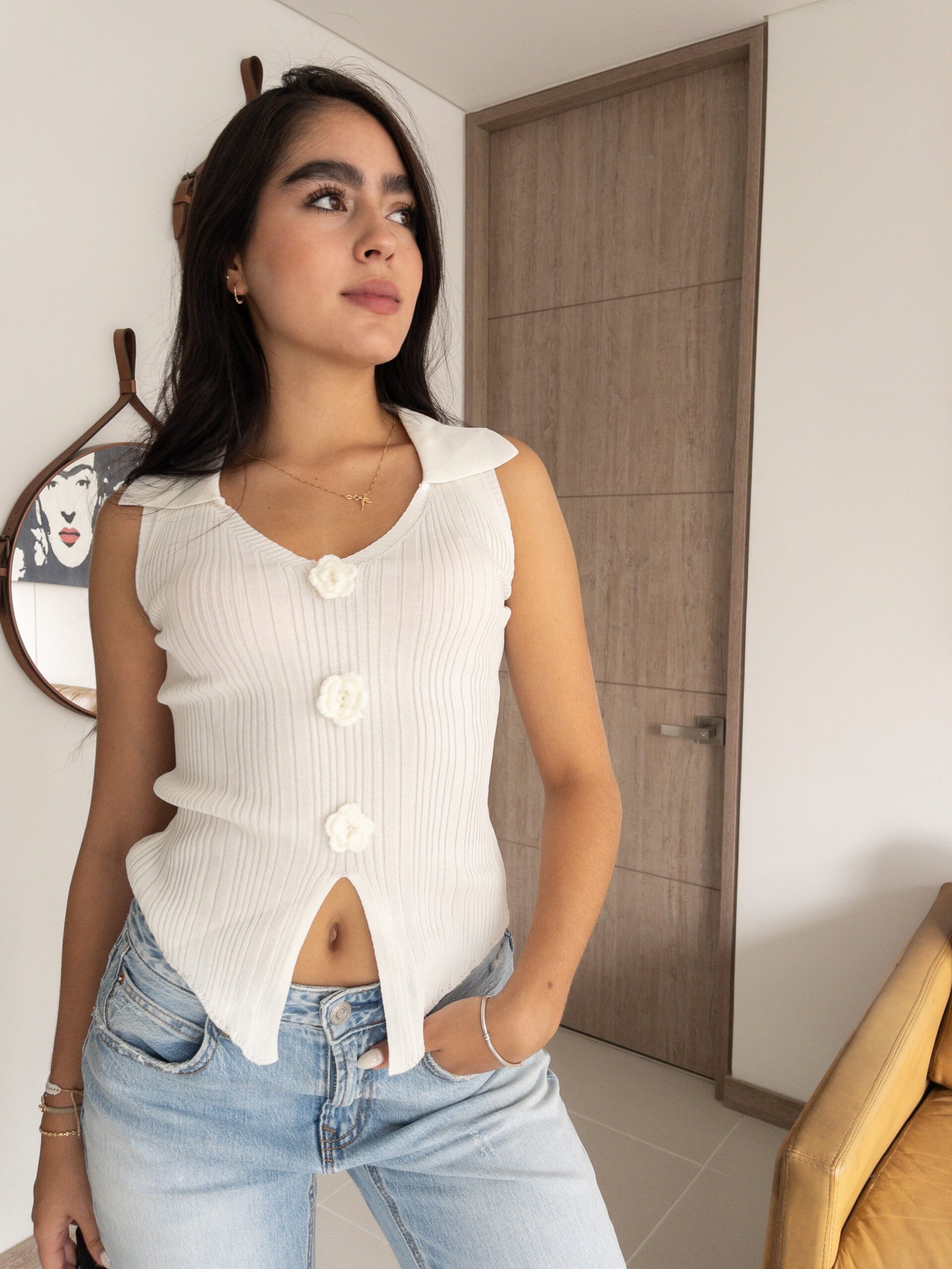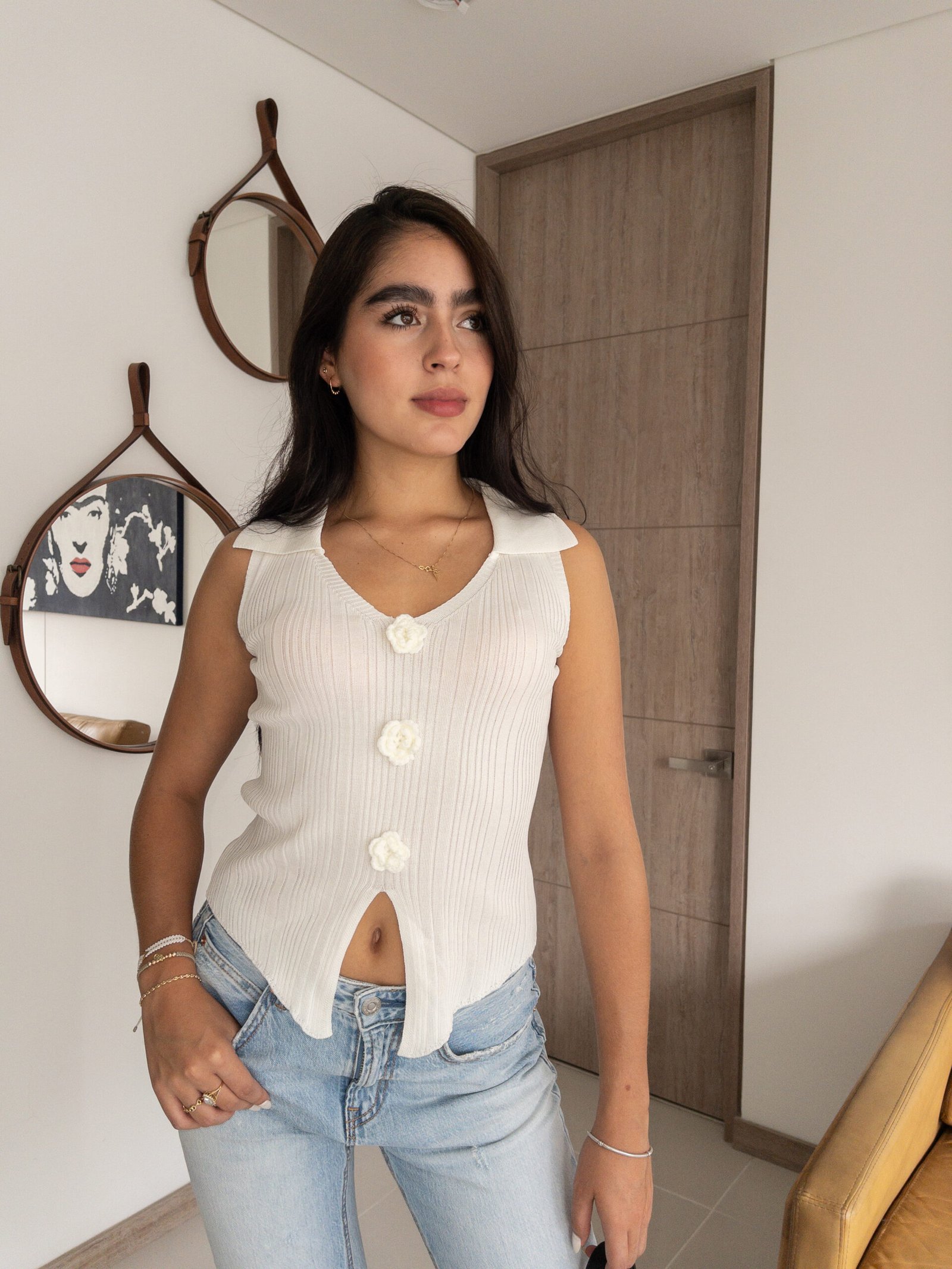 El chaleco tejido sin mangas con cuello camisero y pequeñas flores bordadas al frente es la definición perfecta de sofisticación y atención al detalle. Su diseño equilibrado, que combina delicadeza y estilo, lo convierte en una prenda esencial para quienes buscan realzar sus looks diarios con un toque único. Las flores bordadas añaden un aire fresco y femenino, garantizando un estilo que nunca pasa desapercibido.