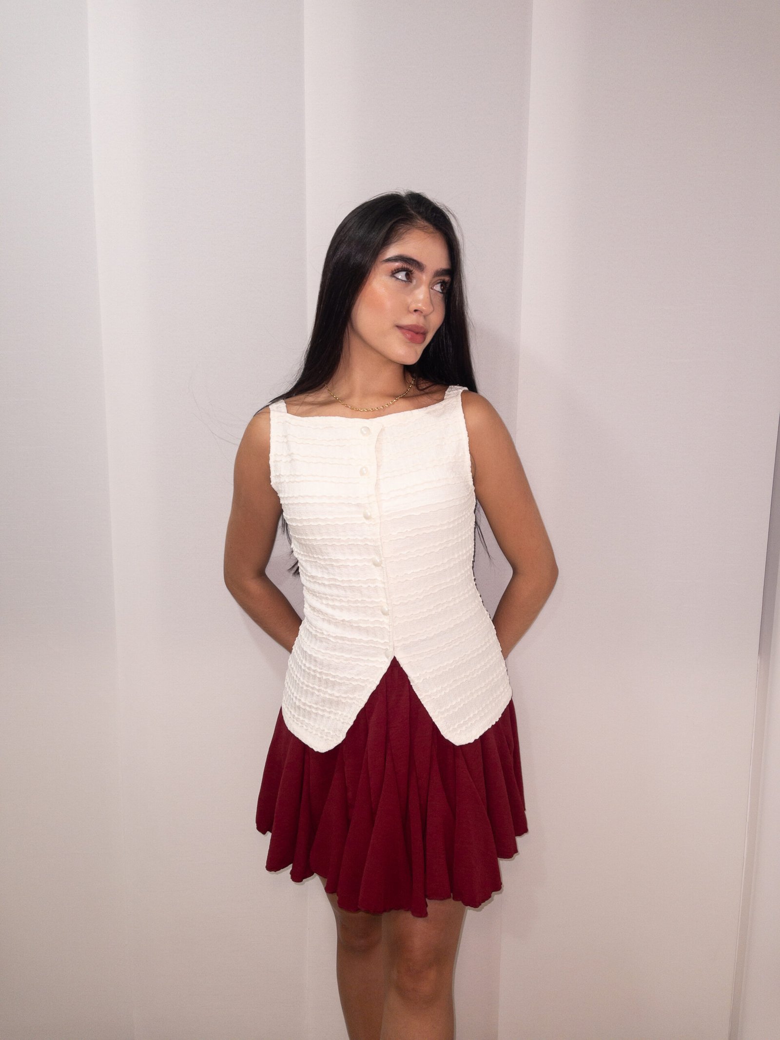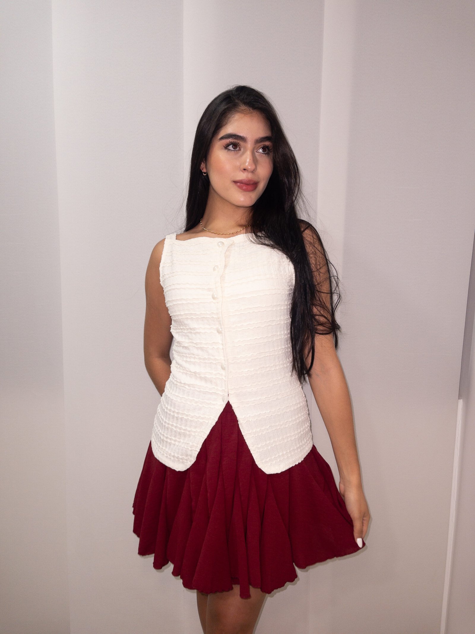 Disponible en dos colores clásicos y versátiles – borgoña y blanco –, esta falda se adapta a cualquier temporada y puede combinarse fácilmente con una gran variedad de prendas y accesorios. Además, su confección en un tejido ligero pero estructurado evita transparencias y garantiza un ajuste cómodo en todo momento.