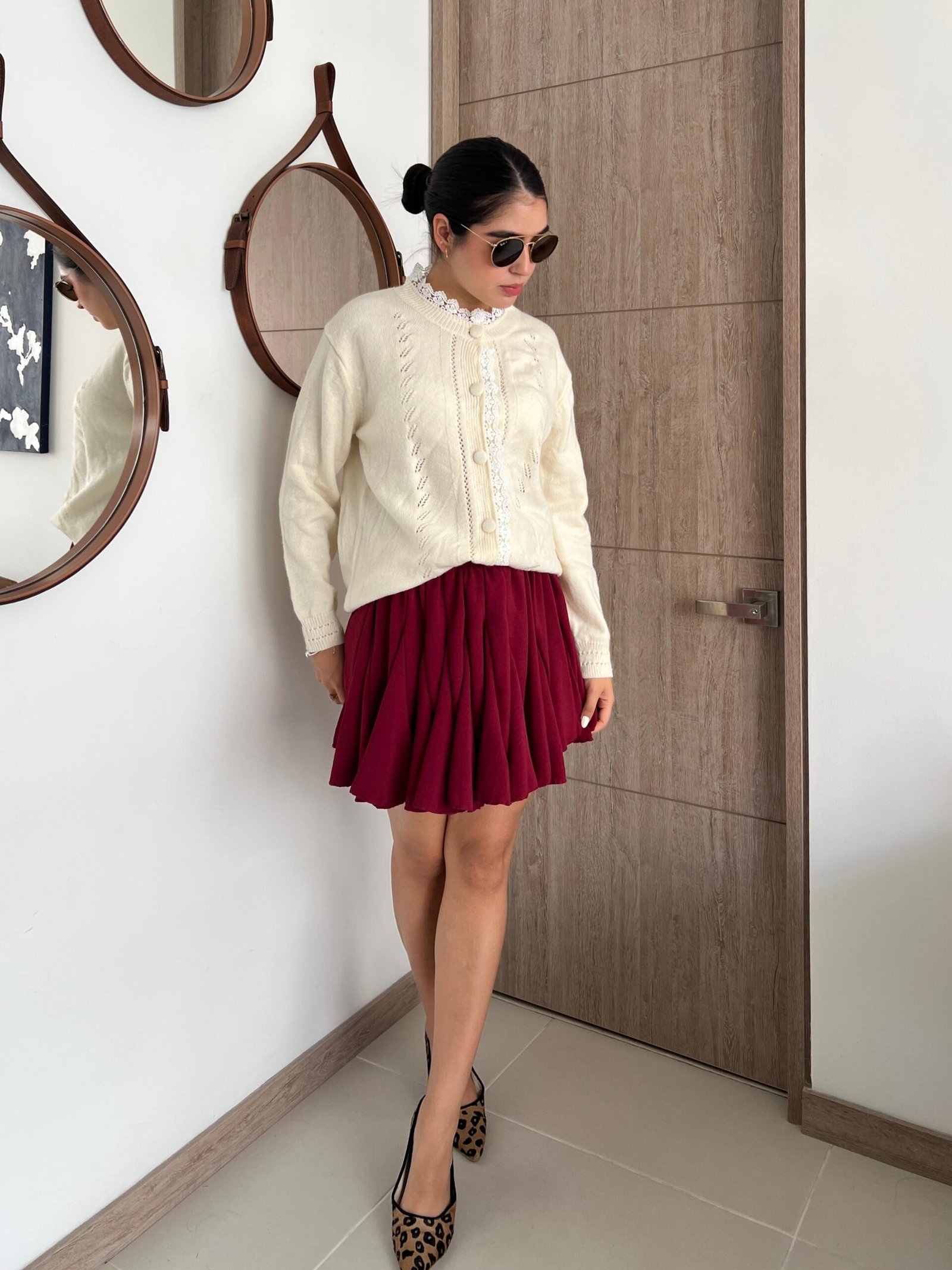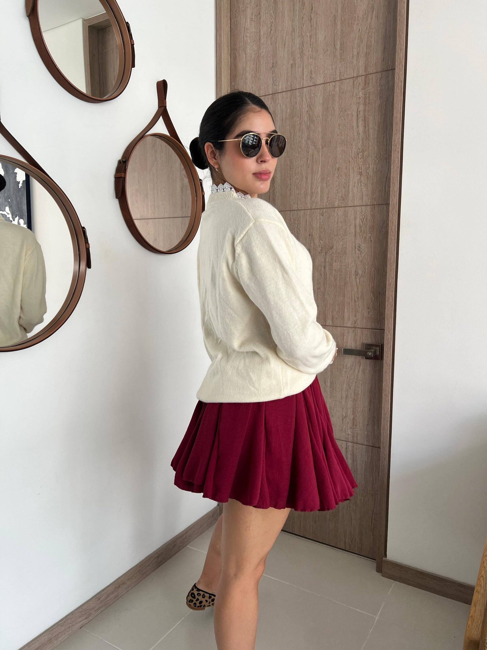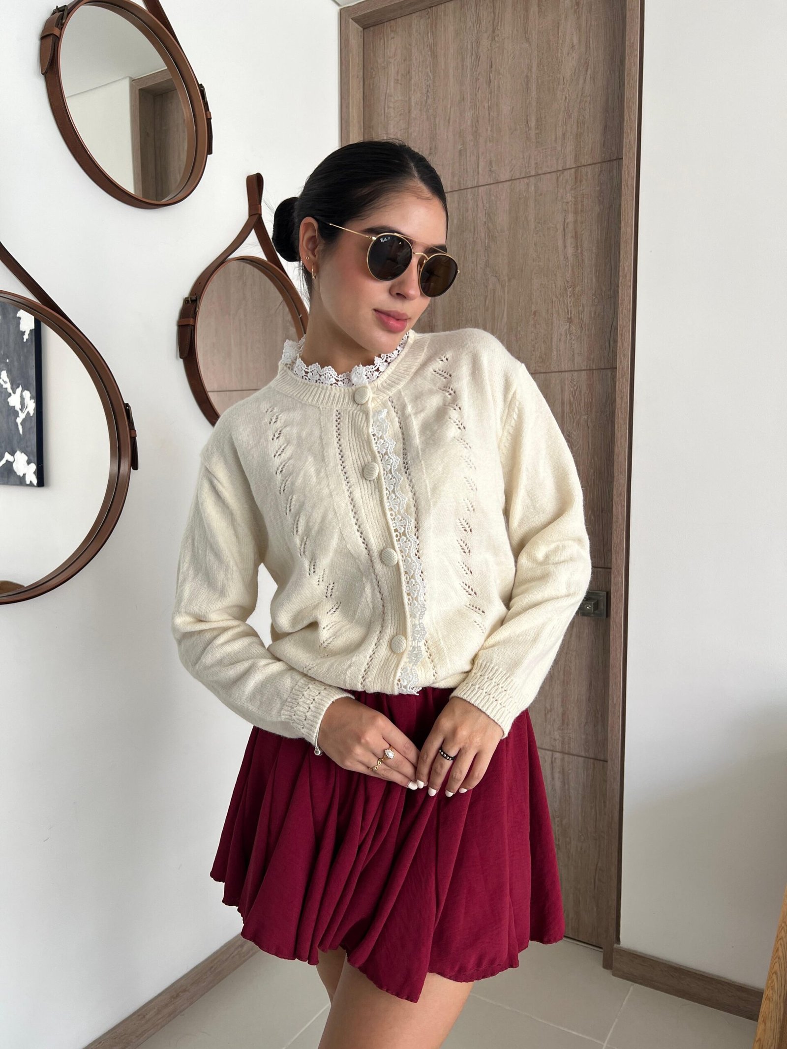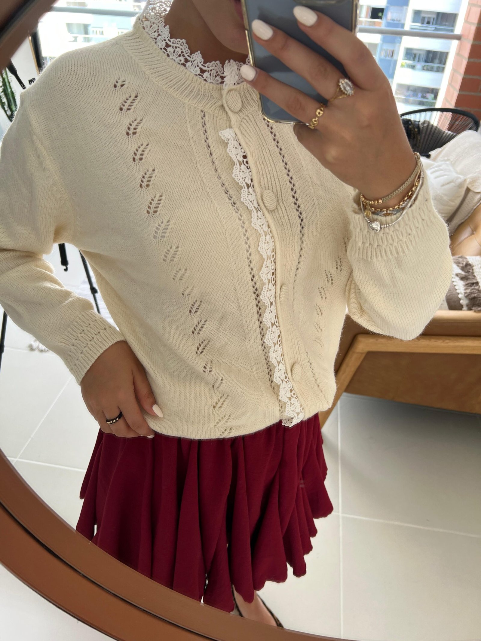 Suéter tejido de punto con elasticidad color crema, con detalles en encaje, con mangas largas con detalles de botones de perlas que le dan un toque femenino y boho. Se adapta pertecto desde la talla S hasta la L gracias a su elasticidad.